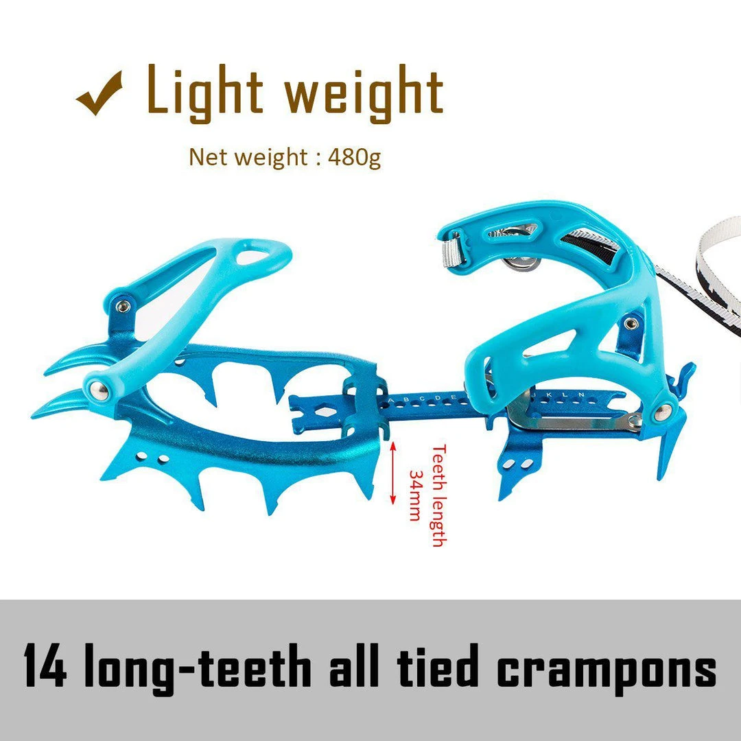 These Ultralight 7075 Aluminum Alloy Crampons are perfect for backpackers who travel light and fast over icy passes. 14 teeth penetrate into the ice holding you firmly to the ground as you traverse mountainsides. Weighing in at only 17 oz you’ll barely notice the extra weight in your pack when they aren’t needed. They are easily adjustable to accommodate rigid boot/shoe sizes 36-46, women’s size 4 to a men’s size 13. These crampons are good for trekking however no aluminum crampon should be used for ice climbing or walking on rocky terrain. Crampons require a rigid shoe, not appropriate for use with traditional trail running shoes. A storage bag is included for the crampons. Â Â