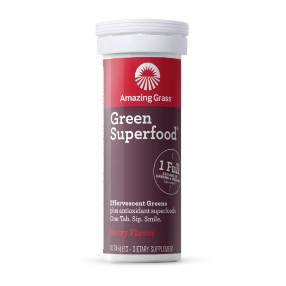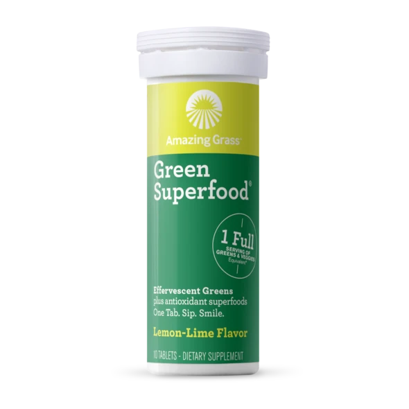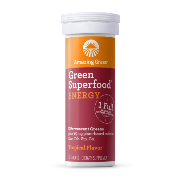 Our Green Superfood® Energy blend thoughtfully combines alkalizing farm greens and nutrients from over 30 antioxidant superfoods plus 85 mg plant-based caffeine, from green tea extract, in a convenient effervescent tablet. Drop one tab into 8-10 fl oz of water for a refreshing way to to help you feel amazing every day.*