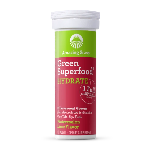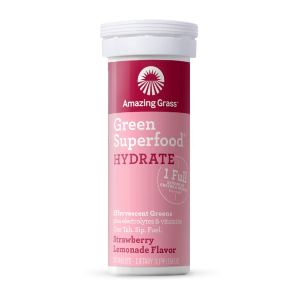 Our Green Superfood® Hydrate blend thoughtfully combines alkalizing farm fresh greens and nutrients from 30 antioxidant superfoods plus electrolytes and vitamins in a convenient effervescent tablet. Drop one tab into 8-10 fl oz of water to help you feel amazing every day.*