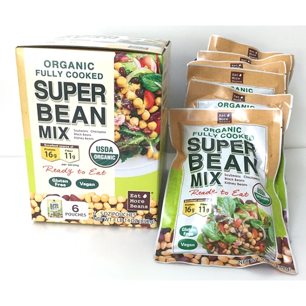 The Organic Super Bean Mix is fully cooked and ready to eat out of the bag. Great way to eat more beans! Each pouch contains a mix of organic soybeans, chickpeas, kidney beans and black beans. These are great to add more protein to ramen noodle soup, couscous, and wraps.