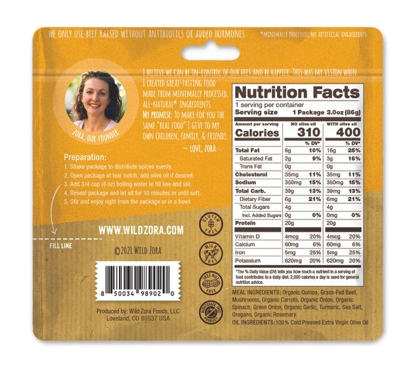 Ingredients: Organic Quinoa, 100% Grass-Fed Beef, Mushrooms, Organic Carrots, Organic Onion, Organic Spinach, Turmeric, Organic Garlic, Sea Salt, Oregano, Organic Rosemary