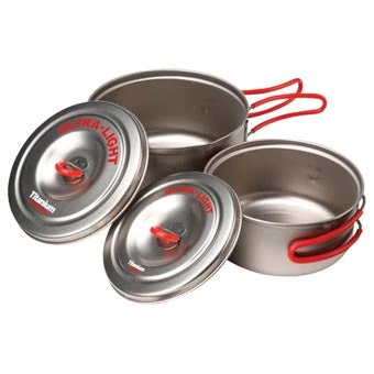 Ultralight titanium pots. Insulated handle with heat resistant silicon. Mesh stuff sack included. Dimensions: 4.9″ x 2.05″ (0.6 L), 5.35″ x 2.52″ (0.9 L). and 5.91″ x 3.03″ (1.3 L). Wt: 3.4 oz (0.6 L), 4.1 oz (0.9 L), and 4.6 oz (1.3 L).