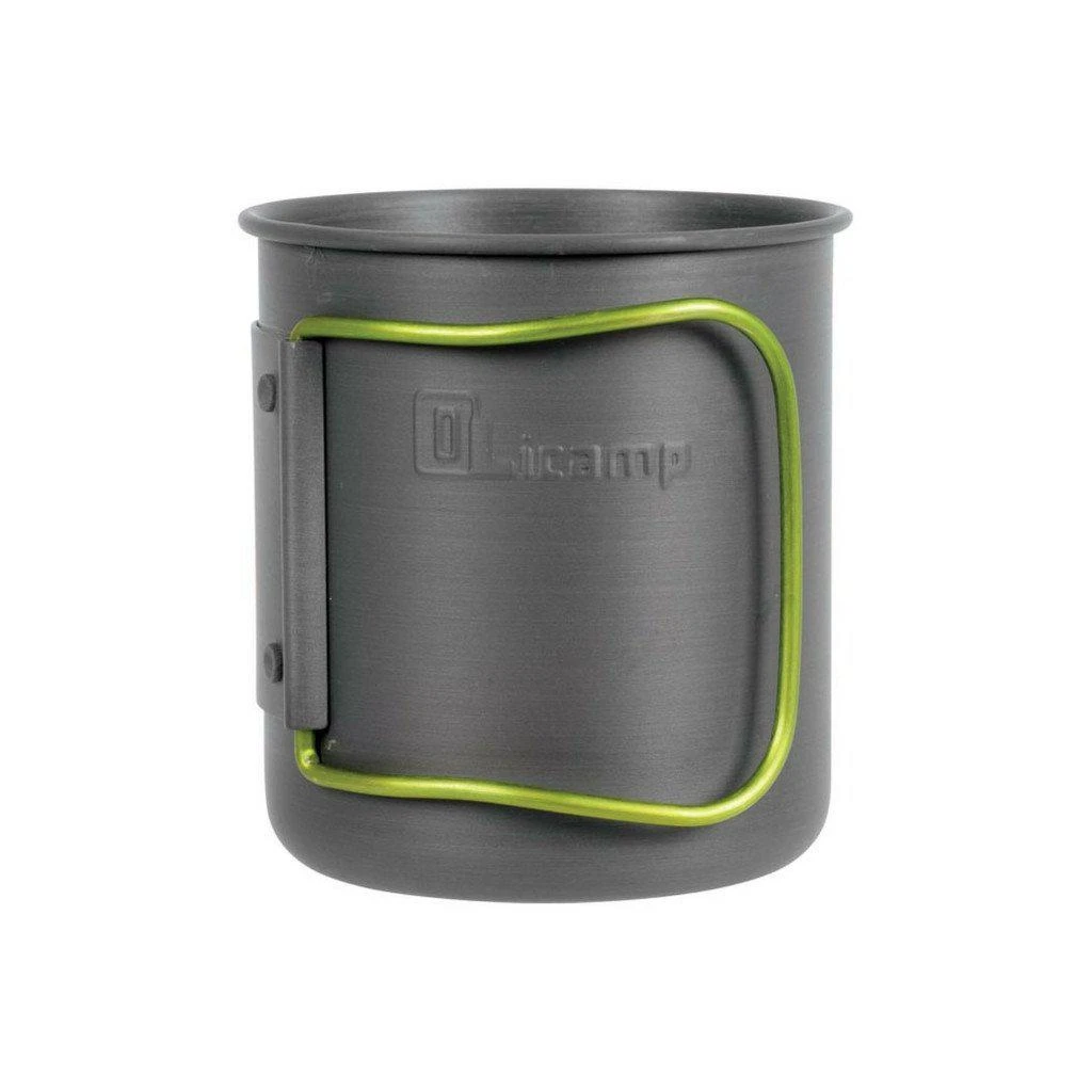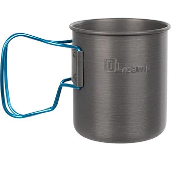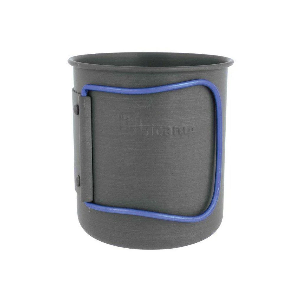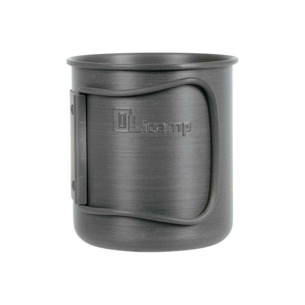 An aluminum version of best selling Space Saver Cup.  The Space Saver Mug fits snuggly over the bottom of a 1 quart, round Nalgene bottle and the Klean Kanteen 40 oz bottle saving valuable space in your pack. Innovative handle design feels more like your favorite mug at home while still folding compactly.  Large enough to boil water for freeze dried meals. Graduations on the side for measuring just the right amount of water.  Holds 24 oz to the brim or 20 oz to the top graduation. Â
