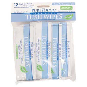 Travel packed as 12 Individual flushable moist wipes. Tush Wipes leave your skin feeling fresh and clean. Biodegradable. Fresher than bathroom tissue. Medicated contains 50% Witch Hazel which is a natural astringent/anti-inflammatory for those irritated bottoms. Relief from itching, irritation & burning. Single use only.