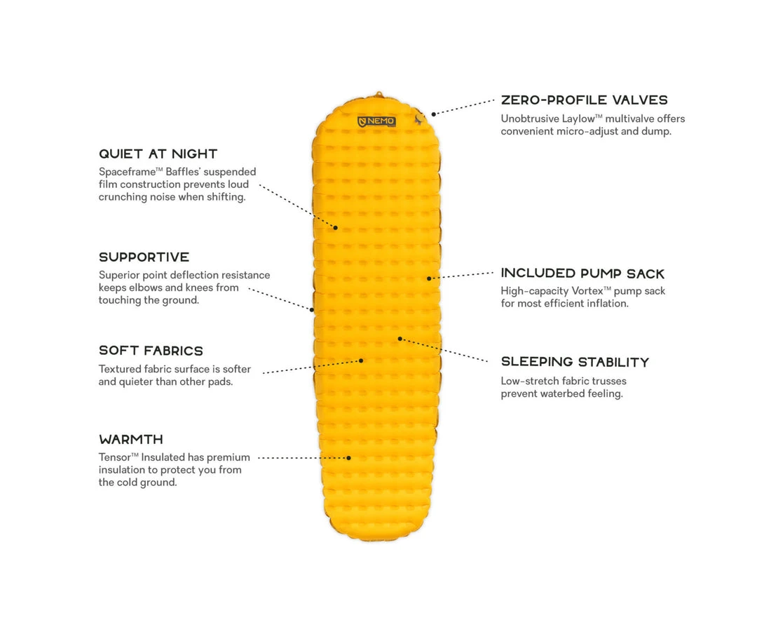 Offering quieter, more supportive sleep at a tiny packed size, Tensor™ ultralight sleeping pad stands apart as the ultimate backcountry adventurer’s best friend. Updated with a zero-profile, micro-adjustable valve and included Vortex™ pump sack, NEMO’s lightest sleeping pad uses premium 20D fabrics to shave grams without sacrificing plush comfort.